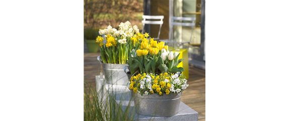Gelb ist die wohl eindeutigste Frühlingsfarbe. In Kombination mit Weiß ist die Freude noch größer. Hier strahlen gelbe und weiße Hornveilchen (Viola cornuta), Narzissen (Narcissus-Hybride) und Tulpen (Tulipa-Hybride) in glänzenden Zinkwannen um die Wette.