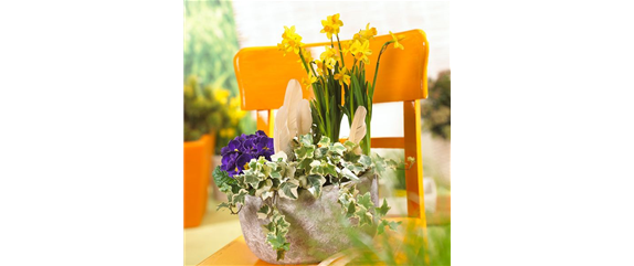 Wer optisch an Höhe gewinnen will, pflanzt hochgewachsene Hyazinthen (Hyacinthus orientalis) und gefüllte Narzissen (Narcissus-Hybride) in ein hohes Gefäß. Zu deren Füßen finden noch Primeln (Primula vulgaris) und Efeu (Hedera helix) einen Platz.