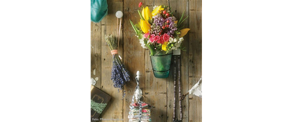 Für die Künstler unter uns – gestalten Sie eine Wand mit liebevollen Dingen. Das geht ganz einfach: Platzieren Sie unterschiedliche Griffe an der Wand und hängen Sie hübsche Vasen mit Blumen daran auf.