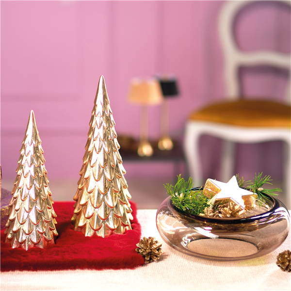 Das goldfarbene Tablett mit elegantem Standfuß in zwei Größen bietet den idealen Rahmen für vielseitige Dekorationen. Darauf sorgen Kerzen aus Kunststoff mit Timerfunktion für warmes Licht und gemütliche Stimmung. Gemeinsam entfalten sie den edlen Charakter des Trends "GLAMOUR TIME"– stilvoll, üppig und ausdrucksstark. Die goldfarbenen Tannen aus Dolomit glänzen mit der Weihnachtszeit um die Wette. Ihre metallische Oberfläche bringt Raffinesse in die Dekoration, einzeln oder im Duo arrangiert. Mit ihrer weichen Formensprache und dem edlen Grauton fügt sich die flache Vase harmonisch in die festliche Inszenierung ein. Ob mit Zweigen, Kerzen oder glänzenden Accessoires bestückt verleiht sie Arrangements eine moderne Note.