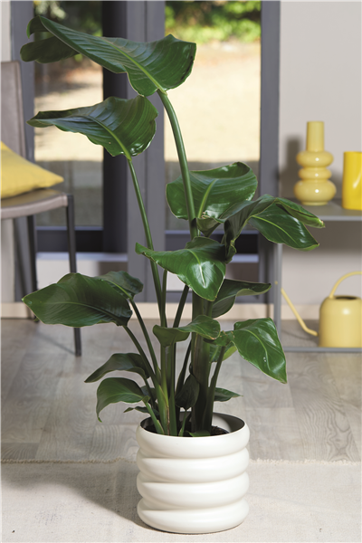 Die Baum-Strelitzie (Strelitzia nicolai) beeindruckt mit ihren großen, fächerartig angeord-neten Blättern, die jedem Raum eine architektonische Wirkung verleihen. Sie bevorzugt helle, sonnige Standorte und gleichmäßig feuchte Erde, ohne Staunässe. Mit ihr lassen sich moderne Wohnkonzepte auflockern und zugleich ein Hauch tropischer Leichtigkeit einbringen.