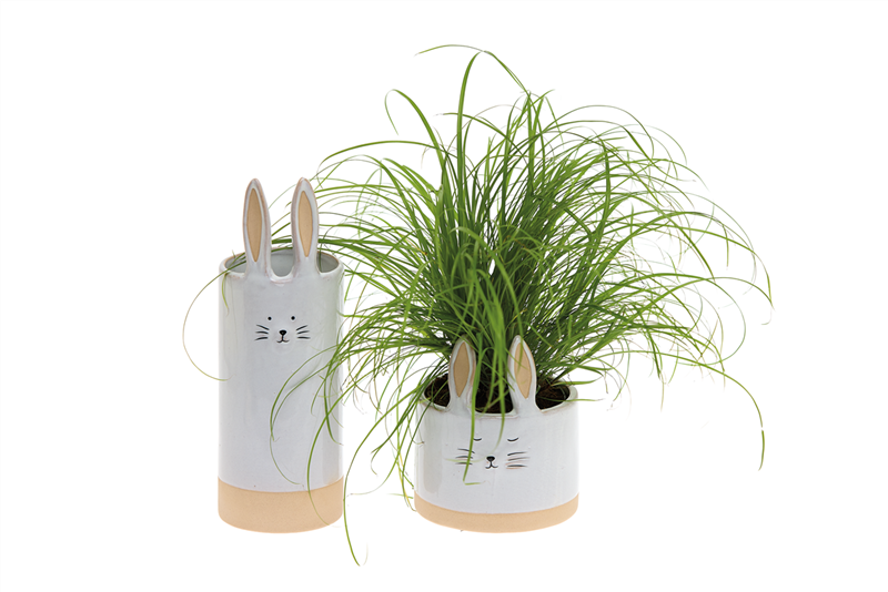 Auch Haustiere profitieren von frischem Grün. Katzengras (Cyperus zumula) und Futterpflanzen wie die Grünlilie (Chlorophytum) oder das Kriechende Schönpolster (Callisia) sind ideal für neugierige Vierbeiner, die gerne an Blättern knabbern. Sie fördern die Ver-dauung, liefern wertvolle Ballaststoffe und stillen den natürlichen Kaudrang von Katzen und kleinen Heimtieren auf natürliche und sichere Weise. In den Topf-Kaninchen aus Steingut finden Futterpflanzen einen stabilen und zugleich dekorativen Platz. Durch ihr Eigengewicht stehen sie sicher, selbst wenn beim Fressen oder Toben etwas Bewegung entsteht.