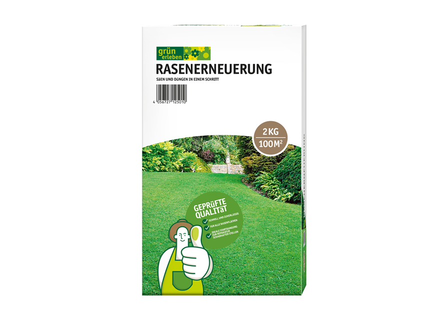 Kombinationsprodukt zur schnellen Regeneration lückiger Rasenflächen. Die Kombination aus einem hochwertigen Rasendünger und qualitativ geprüften RSM-Rasengräsern schafft innerhalb kürzester Zeit einen dichten und belastbaren Rasen. Die Rasengräser zeichnen sich durch ihr dichtes und sattes Grün aus. Die hohe Qualität der Rasengräser sind durch die unabhängige Forschungsgesellschaft Landschaftsentwicklung und Landschaftsbau auf Ihre Eignung mit dem RSM Gütenachweis dokumentiert. Diese geprüften Rasengräser zeichnen sich ebenso durch ihre hohe Vitalität und Regenerationskraft aus. Säen und Düngen in einem Arbeitsschritt für eine schnelle Rasenreparatur und einer perfekten Rasenoptik.